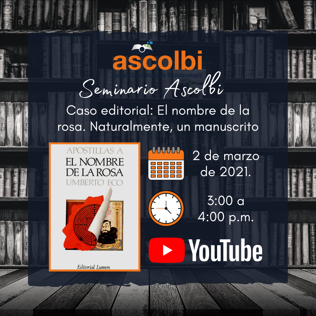 El próximo martes 2 de marzo de 2021 a las 3:00 p.m. realizaremos una nueva transmisión del Seminario Ascolbi, nos sumergiremos en el ‘Caso editorial: El nombre de la rosa. Naturalmente, un manuscrito’, Wilson Colmenares compartirá, a través de un análisis editorial, la importancia de este libro y su profunda relación con las bibliotecas y los bibliotecarios. ¡Los esperamos!