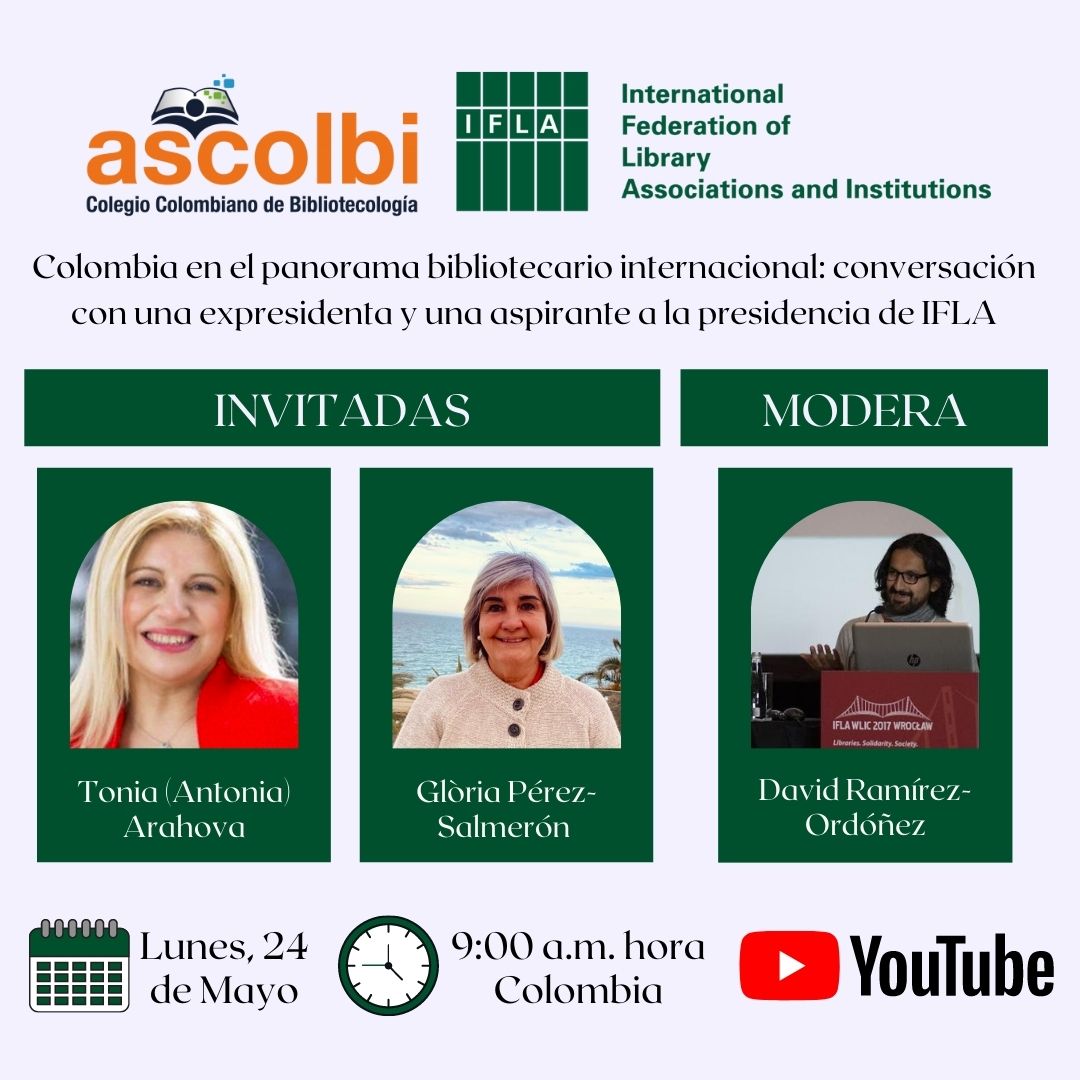 El próximo lunes 24 de mayo a las 9:00 a.m. realizaremos el Seminario Ascolbi donde conversaremos con Tonia Arahova (Grecia), candidata a presidenta de IFLA y con Glòria Pérez-Salmerón (España), presidenta de la Fundación “Stichting IFLA Global Libraries” y expresidenta de la misma federación.
