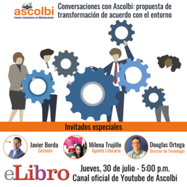 En nuestra próxima transmisión de Conversaciones con Ascolbi: bibliotecología en contexto, la cual estaremos realizando el próximo jueves 30 de Julio a las 5:00 p.m., estará con nosotros eLibro, uno de nuestros afiliados empresariales, quienes nos estarán contando sobre los inicios de la empresa y los distintos proyectos que están llevando a cabo.