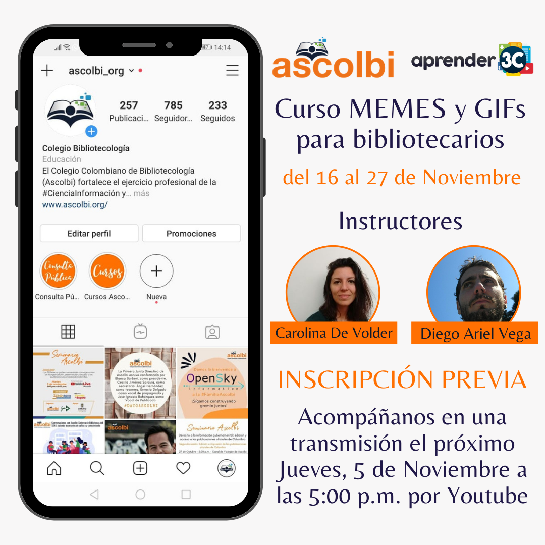 Ascolbi se complace en compartir con la comunidad el nuevo curso virtual MEMES y GIFs para bibliotecarios, el cual será impartido del 16 al 27 de Noviembre, con inscripción previa y un pequeño costo.