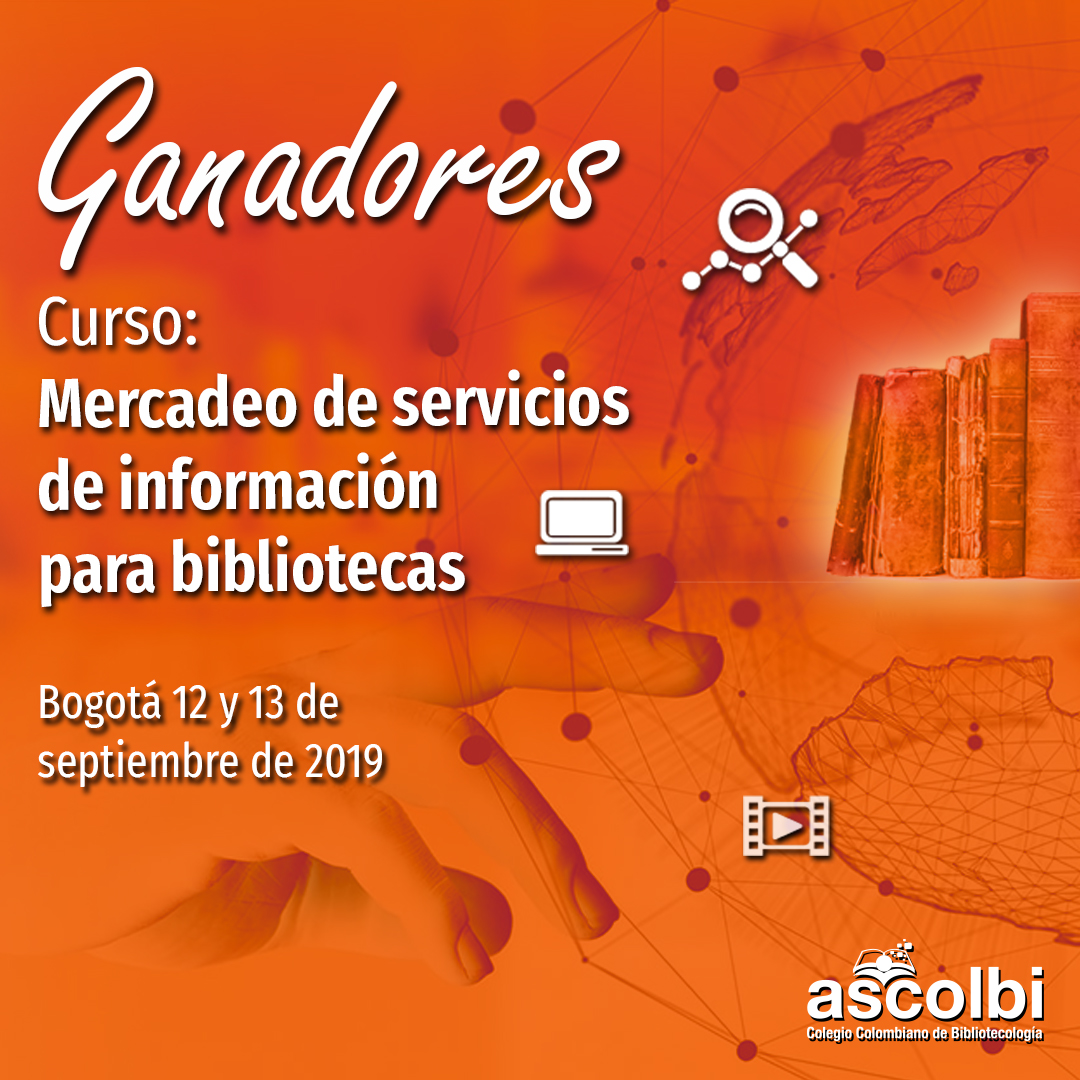 Ascolbi tiene el gusto de comunicar los ganadores de las becas para asistir de forma gratuita al Curso: mercadeo de servicios de información para bibliotecas, que se llevará a cabo en la ciudad de Bogotá el 12 y 13 de septiembre de 2019.