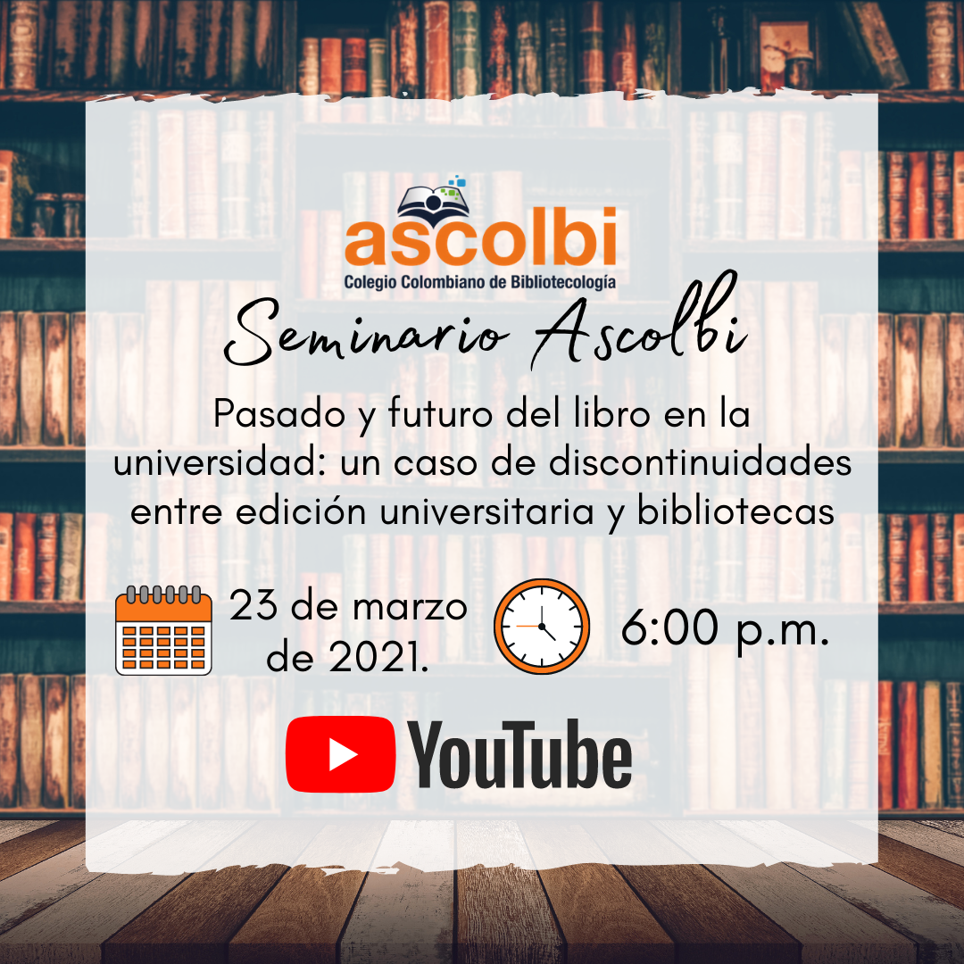 El próximo martes 23 de marzo de 2021 a las 6:00 p.m. realizaremos una nueva transmisión del Seminario Ascolbi, en el que se presentará un estudio de caso que aborda las relaciones que tienen los autores, editores y bibliotecarios académicos y sugiere que algunos baches ponen en riesgo el uso colectivo del conocimiento.