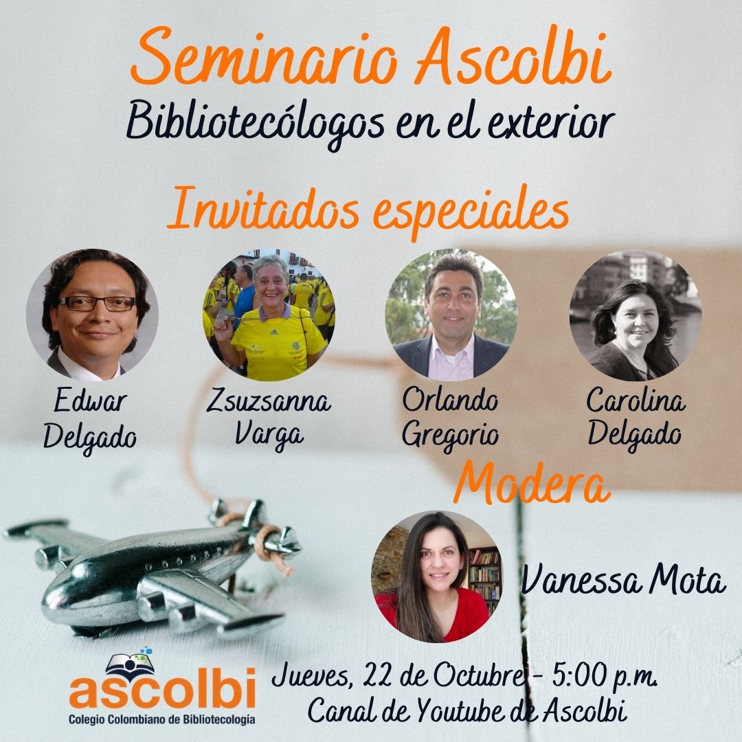 Para nuestra nueva transmisión del Seminario Ascolbi, hemos invitado a cuatro profesionales en bibliotecología y ciencias de la información, quienes se encuentran ejerciendo, o han ejercido, su profesión en el exterior. Continuamos con la labor de dimensionar el contexto profesional tanto dentro como fuera de Colombia para dar un panorama necesario para todos los estudiantes y profesionales que estén planeando irse del país o desean conocer las experiencias de quienes han llegado aquí.