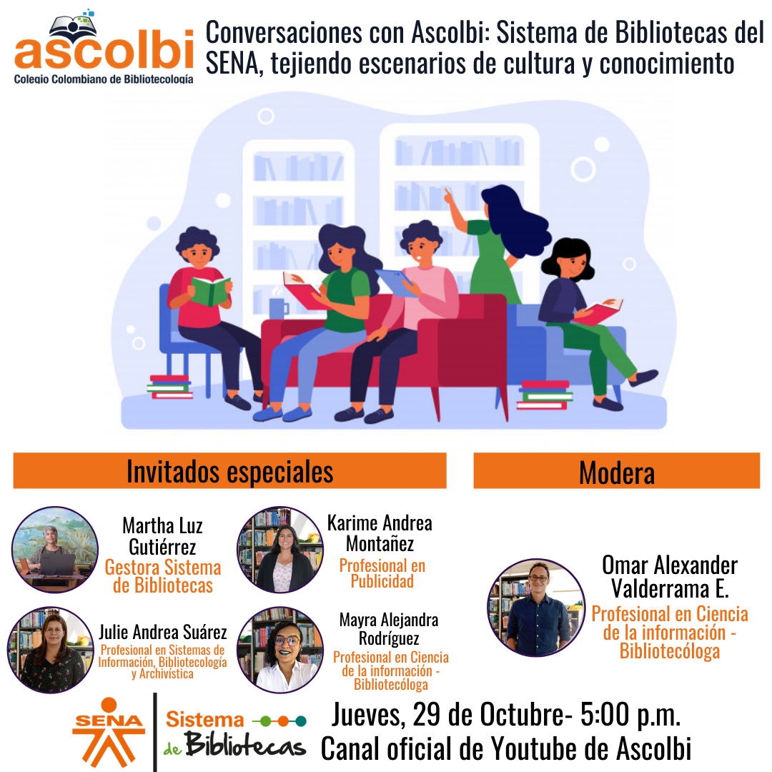 En esta nueva transmisión, haremos un recorrido a través de los hitos históricos que han marcado este Sistema de Bibliotecas, así como las proyecciones que se vienen trabajando. Teniendo esto en cuenta, esperamos que nos acompañen en esta nueva transmisión de Conversaciones con Ascolbi: Sistema de Bibliotecas del SENA, tejiendo escenarios de cultura y conocimiento. A continuación, les dejamos toda la información necesaria para que nos acompañen: