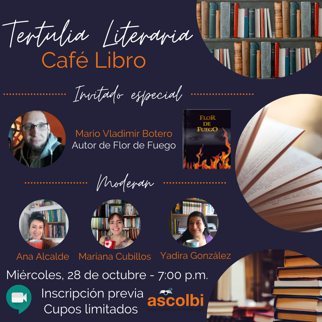 La tertulia literaria Café Libro nace de la iniciativa de ASCOLBI para ofrecer a sus afiliados un espacio de esparcimiento y cultura alrededor del aroma de un café y de la lectura de un libro, que permita la interacción entre participantes, autores y obras. Para llevar a cabo esto, el Colegio Colombiano de Bibliotecología, crea un voluntariado que organiza la tertulia una vez al mes. En este formulario podrán realizar la inscripción para participar en una sala privada de meet cupos limitados, la cual será transmitida por nuestro canal de youtube; esto permitirá la interacción directa con el autor.
