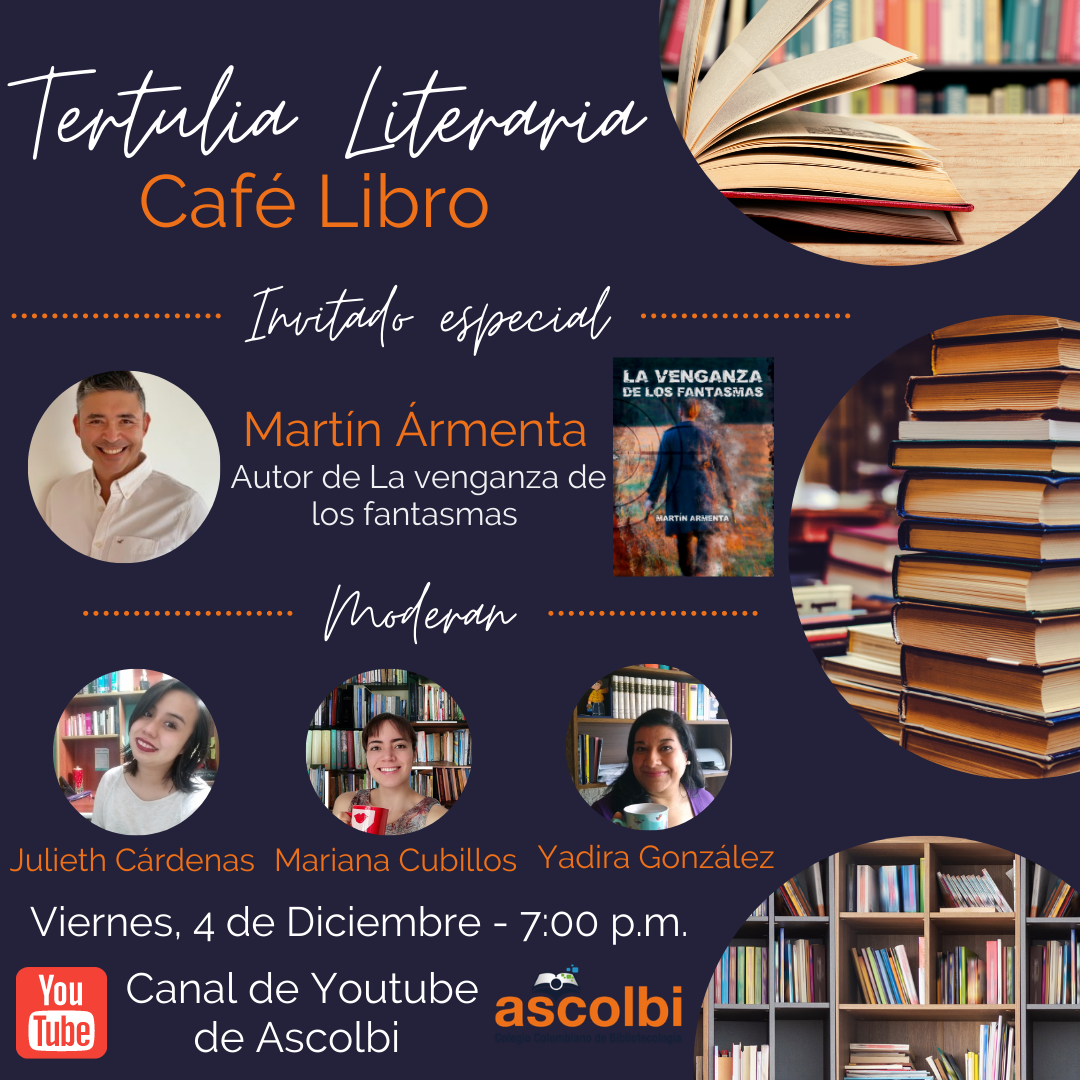 Con el ánimo de continuar compartiendo otro encuentro de obras y autores, tenemos el gusto de invitarles a la segunda tertulia literaria Café Libro. Esta vez contaremos con el acompañamiento del autor colombiano Martín Armenta con su obra “La Venganza de los Fantasmas”. Este evento organizado por el grupo de voluntarios de ASCOLBI, ofrece a sus afiliados un espacio de esparcimiento y cultura alrededor del aroma de un café y de la lectura de un libro, que permita la interacción entre participantes, autores y obras. Así mismo pueden visitar su página en https://martinarmenta.com