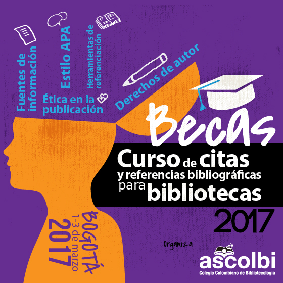 Invitamos a los estudiantes de Ciencia de la Información y Bibliotecología de Colombia y a los afiliados individuales e institucionales a participar en las dos becas que otorga Ascolbi para asistir de forma gratuita al Curso de citas y referencias bibliográficas para bibliotecas, que se llevará a cabo en la ciudad de Bogotá del 1 al 3 de marzo de 2017.