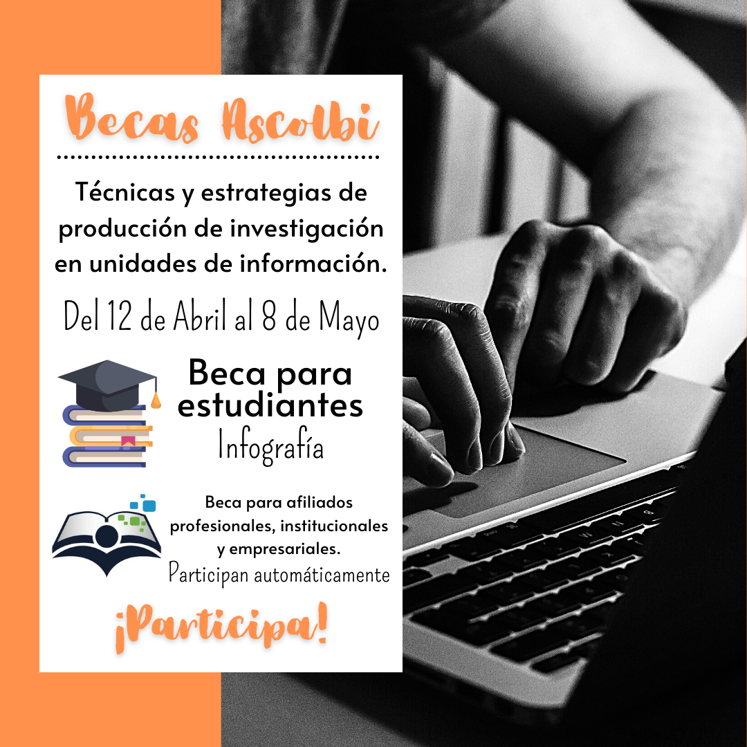 Si es estudiante activo de bibliotecología de Colombia, afiliado individual o institucional a Ascolbi y está interesada (o) en recibir formación en Técnicas y estrategias de producción de investigación y fortalecer su función misional de promoción, difusión y acceso a la información, le invitamos a participar en las siguientes becas: