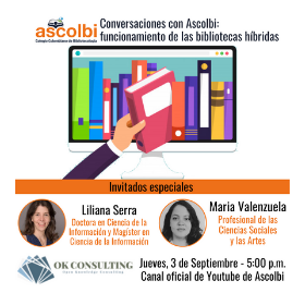 En nuestra nueva transmisión de Conversaciones con Ascolbi: bibliotecología en contexto, que será el próximo jueves 3 de septiembre a las 5:00 p.m., estará con nosotros Open Knowledge Consulting, uno de nuestros afiliados empresariales, que nos hablarán de un tema muy interesante: las bibliotecas híbridas.