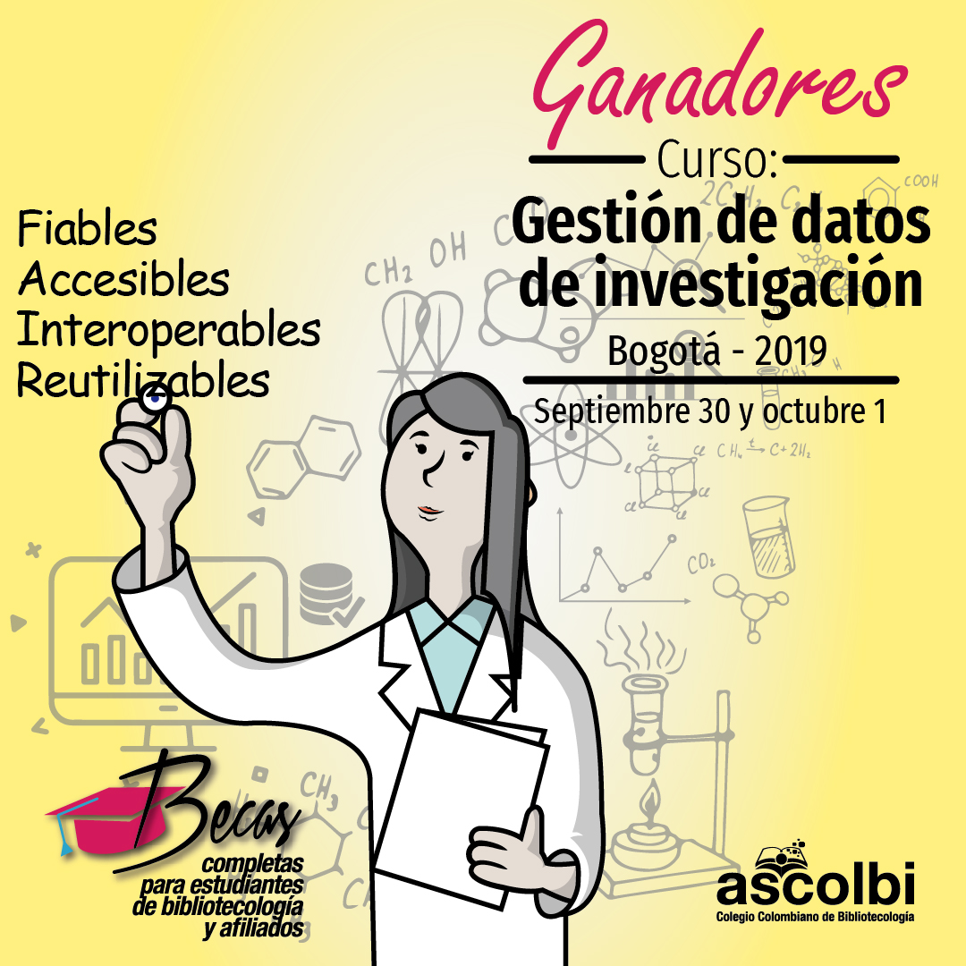 Ascolbi tiene el gusto de comunicar los ganadores de las becas para asistir de forma gratuita al Curso: Gestión de datos de investigación, Bogotá, 2019, que se llevará a cabo en la ciudad de Bogotá el 30 de septiembre y 1 de octubre de 2019.