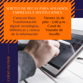 Ascolbi ofrece dos becas para estudiantes y afiliados a todos los cursos y talleres que imparte. En esta ocasión, extendemos la invitación a participar del sorteo de una beca para afiliados profesionales, otra para afiliados empresariales e institucionales, y el ganador del concurso de una beca para estudiantes, que permitirá la participación gratuita al Curso en línea de Transformación digital: tecnologías, bibliotecas y ciencia de la información que se estará realizando el próximo 3 de agosto.